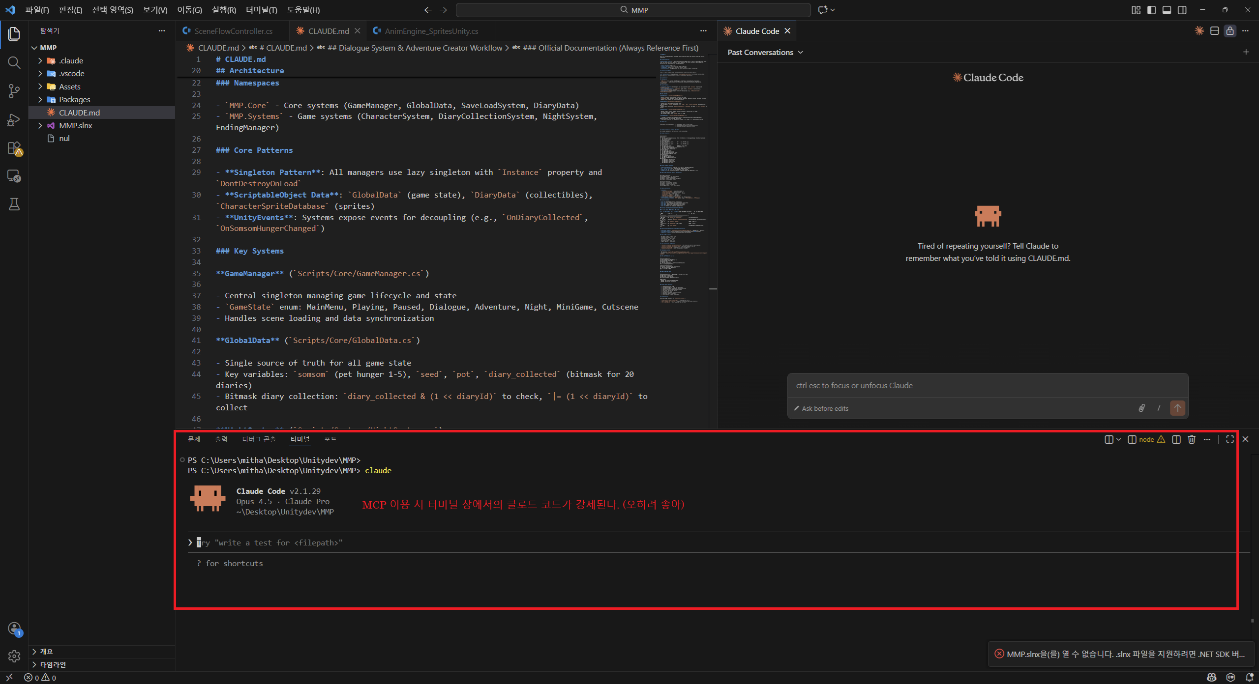 Unity MCP 덕분에 Claude와 실시간으로 소통하면서 코드를 테스트하고 디버깅할 수 있게 되었어요. 혼자 개발하는 입장에서 이만큼 든든한 조력자가 또 있을까요. 특히 밤늦게 개발하다가 막힐 때, 바로 물어보고 답을 얻을 수 있다는 게 정말 큰 위안이 됩니다.